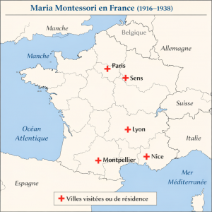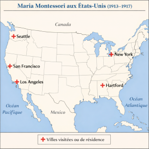Je teste donc chatGpt pour voir ce qu’il ressort comme information. Et je constate, sur les cartes générées ci-dessous, que les résultats ne sont pas fiables, ni pour les lieux français visités par Maria (Maria n’est jamais allée ni à Montpellier ni à Sens, voir le livre « Les voyages en France de Maria Montessori »), ni pour ceux visités aux USA (Maria est allée à Washington DC, Chicago, San Diego, etc, voir le livre « Montessori aux USA »).
