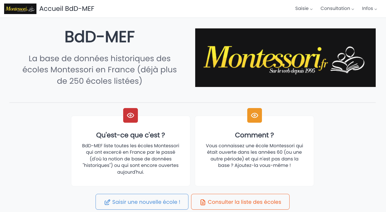Fruit du travail en binôme entre Murielle et Alain Lefebvre, créateurs du premier et seul site internet montessori français ayant 30 années d’existence, sans publicité, et gratuit, cette base de données sera elle aussi gratuite et sans publicité.