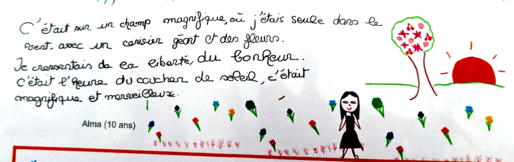 Aujourd’hui, on me parle d’un atelier annuel d’écriture pour les enfants, et j’en vois les productions écrites et dessinées dans un livret.