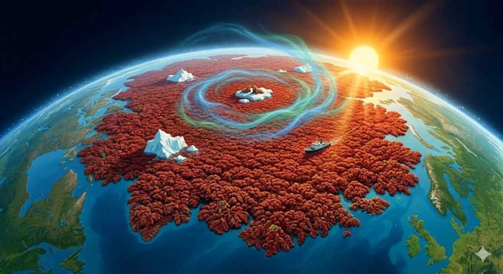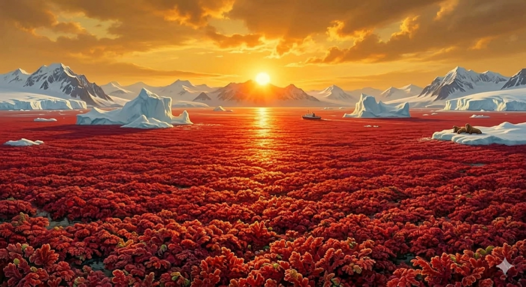 Azolla commença à se multiplier. Une, deux, quatre, huit fois… Elle doublait de taille chaque jour. Bientôt, les lacs et les océans du Grand Nord furent recouverts d’un immense tapis vert, puis rouge-sang sous le Soleil ardent.