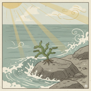 Mais l’algue était curieuse. Elle regardait les rochers gris et secs au bord de l’eau. Un jour, une petite algue verte a décidé de tenter l’aventure. Elle a appris à s’accrocher aux rochers avec son crampon, et elle a résisté au vent et au soleil. C’était une belle victoire.