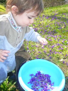 Tout d’abord, nous proposons de récolter les fleurs de violette (l’odeur vous guidera !).