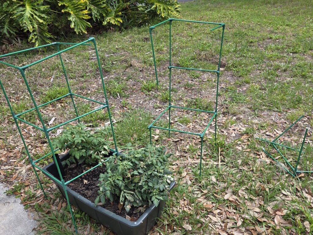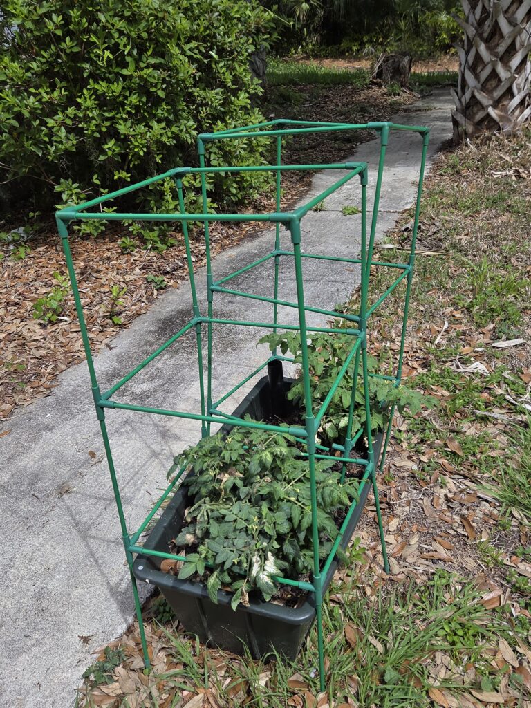 Ce matin, j’ai voulu mettre en place un tuteur pour des pieds de tomate chez une amie. Un pied profitait déjà de cette architecture -hélas en plastique-.